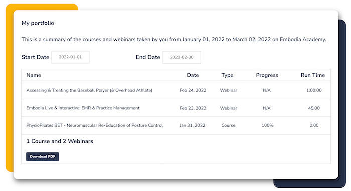 Embodia keeps a record of all courses taken and webinars attended for you. Head over to your professional portfolio on Embodia. Select a date range and download your continuing education summary anytime.