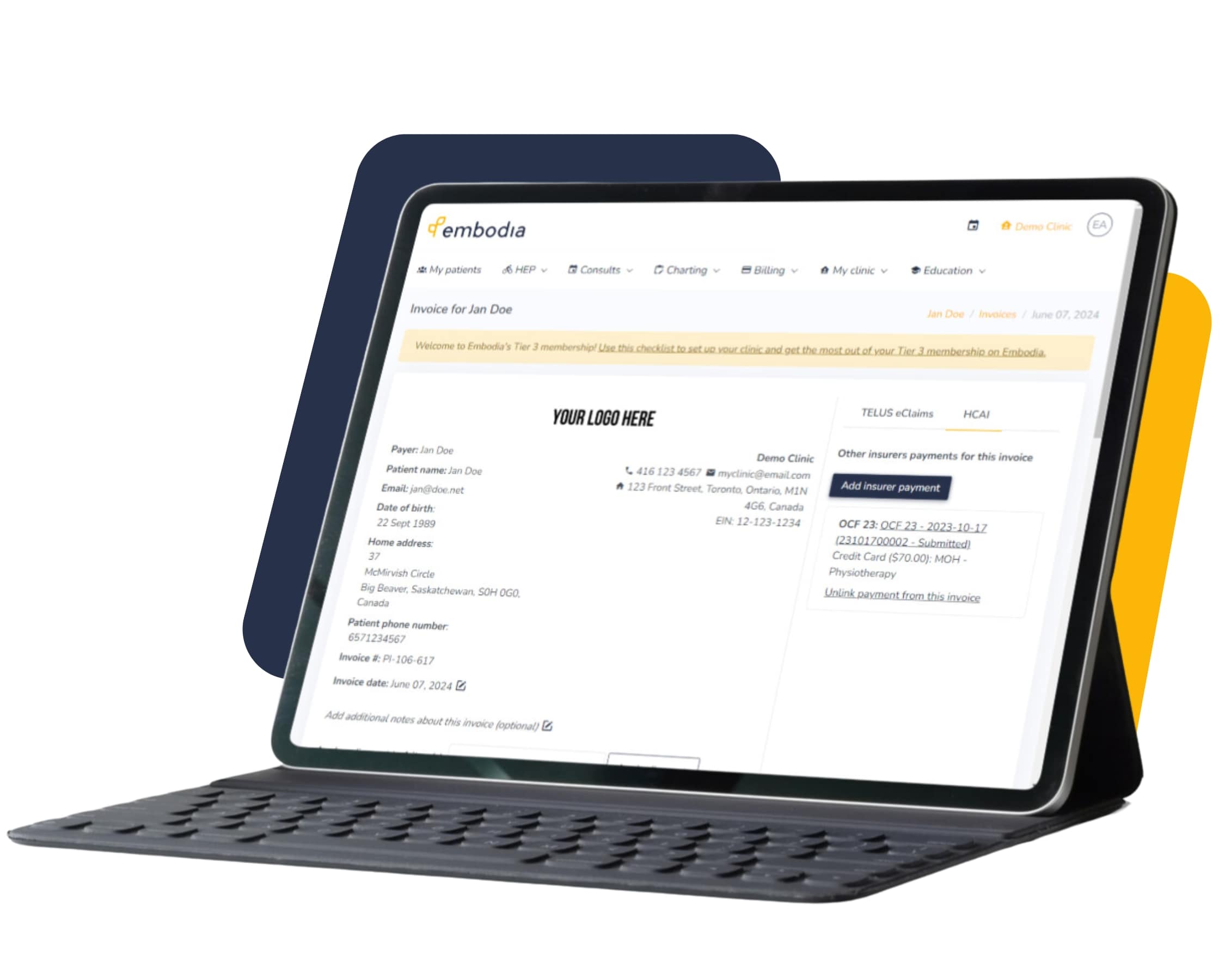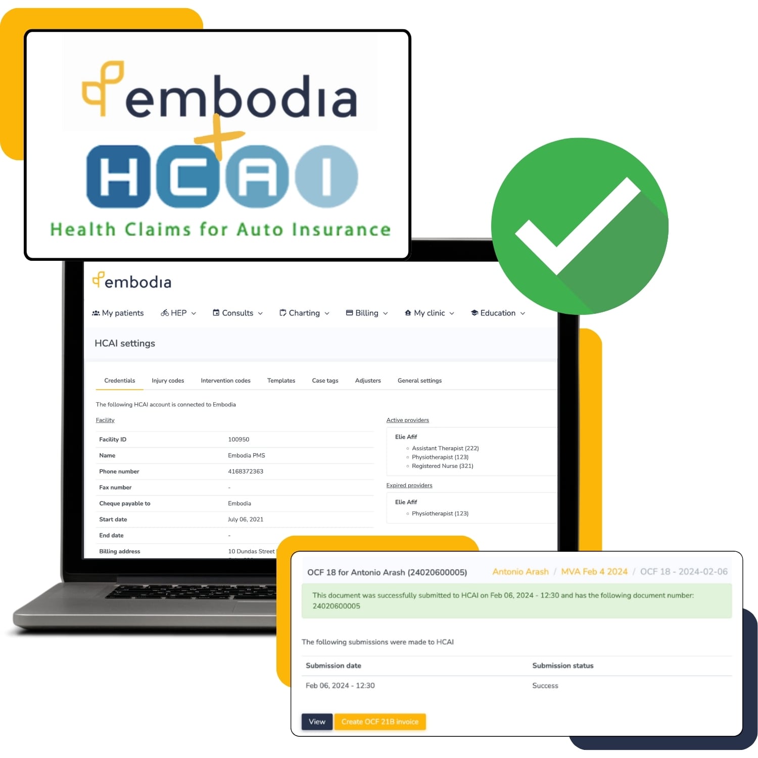 Embodia’s all-in-one practice management system (and app), with its robust HCAI integration, makes the paperwork simple so you can focus on your patients. Save time and administrative hassle by managing your booking, billing, charting, tracking, and insurance submissions all in one place.
